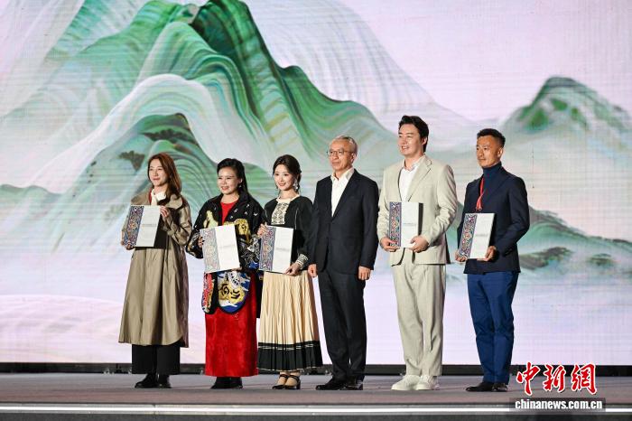 3月30日早,龚琳娜(左两)、毛晓彤(左3)、弛英席(左两)等蒙聘为贵州文明战游览推行年夜使。中新社记者 瞿宏伦 摄