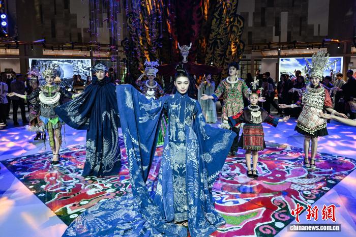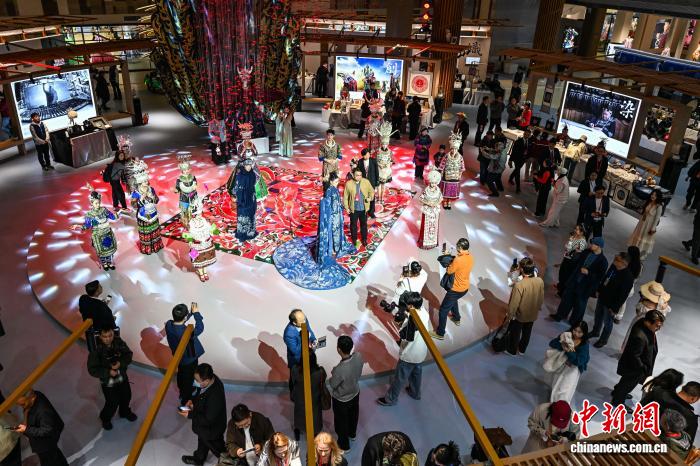3月30日早,非遗所念·匠心潮动中心铺上的平易近族衣饰秀。中新社记者 瞿宏伦 摄